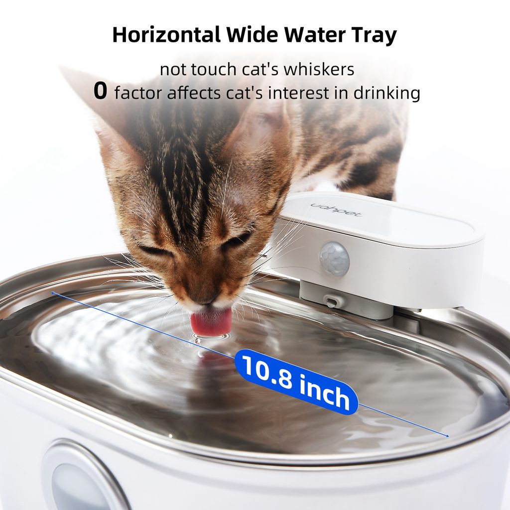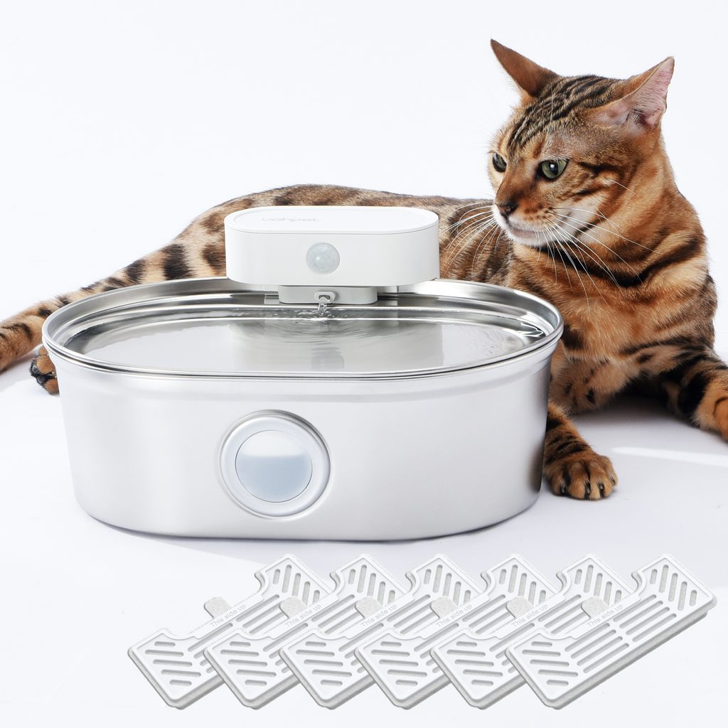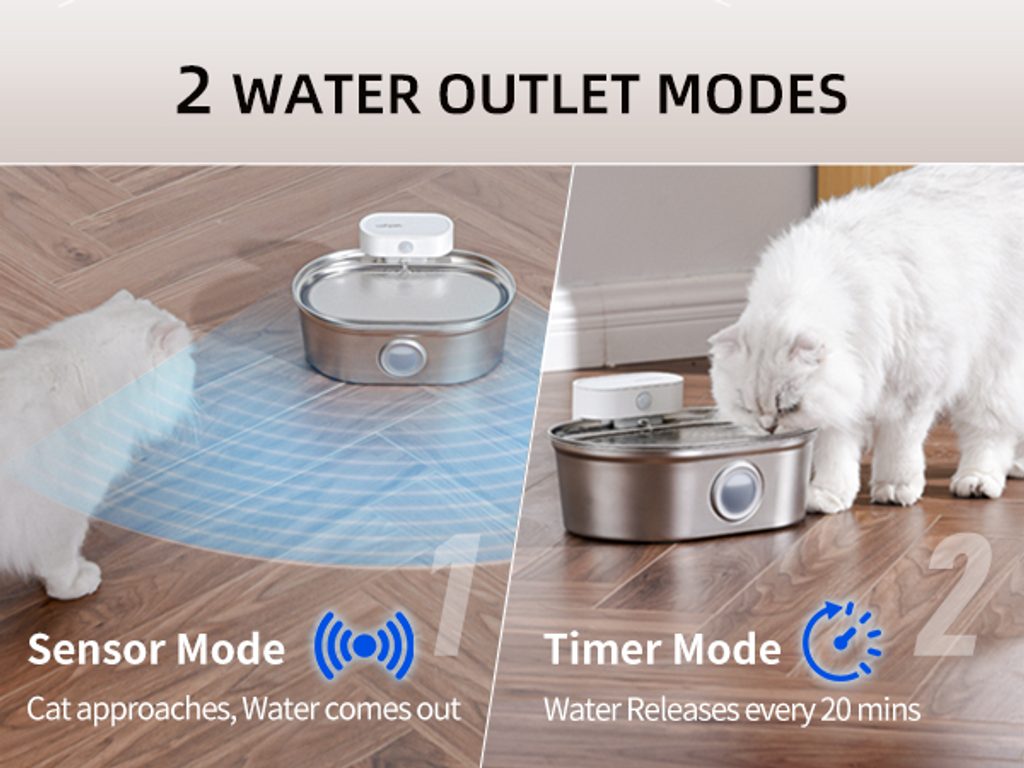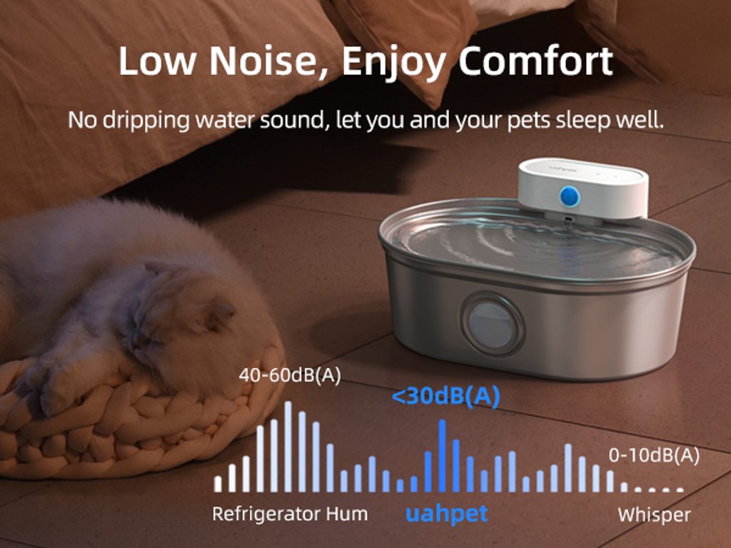 The UahPet fountain works in two modes: a timed mode that switches on the water flow every 20 minutes, and a sensor mode. The sensor automatically detects your pet’s presence and turns on the water flow as soon as your pet approaches the fountain—within a 120-degree range around the fountain. Set the fountain to suit you and your pet best. Quiet operation below 30 dB ensures you can enjoy peaceful rest.