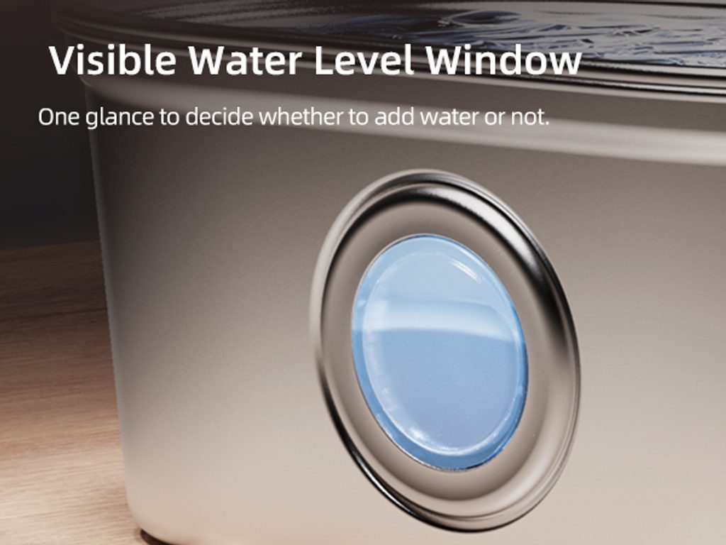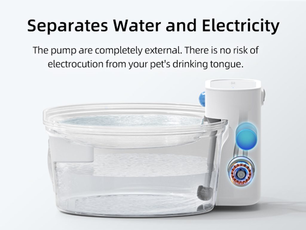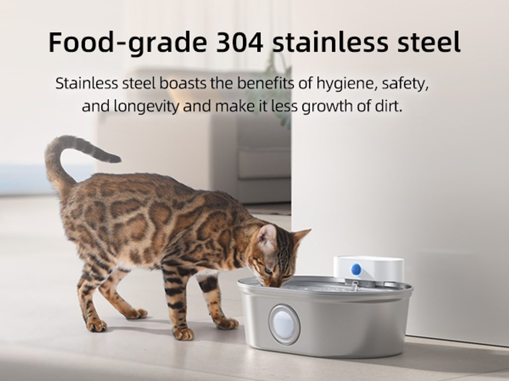 The external pump ensures that maintenance of the water pump is simple and completely safe. You won’t have water getting into the electrics. Stainless steel is safe for health and hygienic, easy to maintain and clean. The material is also very durable and will last for years of use. Thanks to the window, it is easy to see the water level and whether the fountain needs topping up.