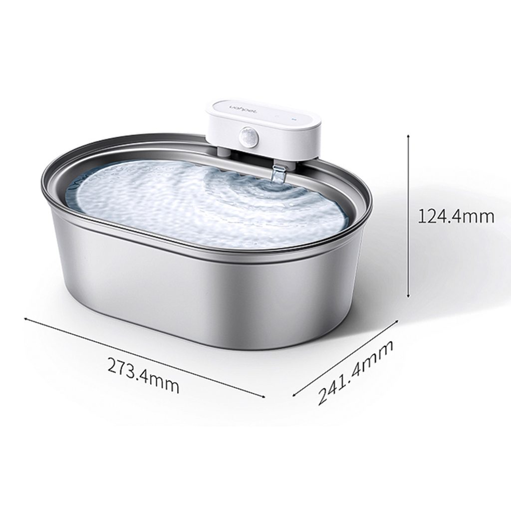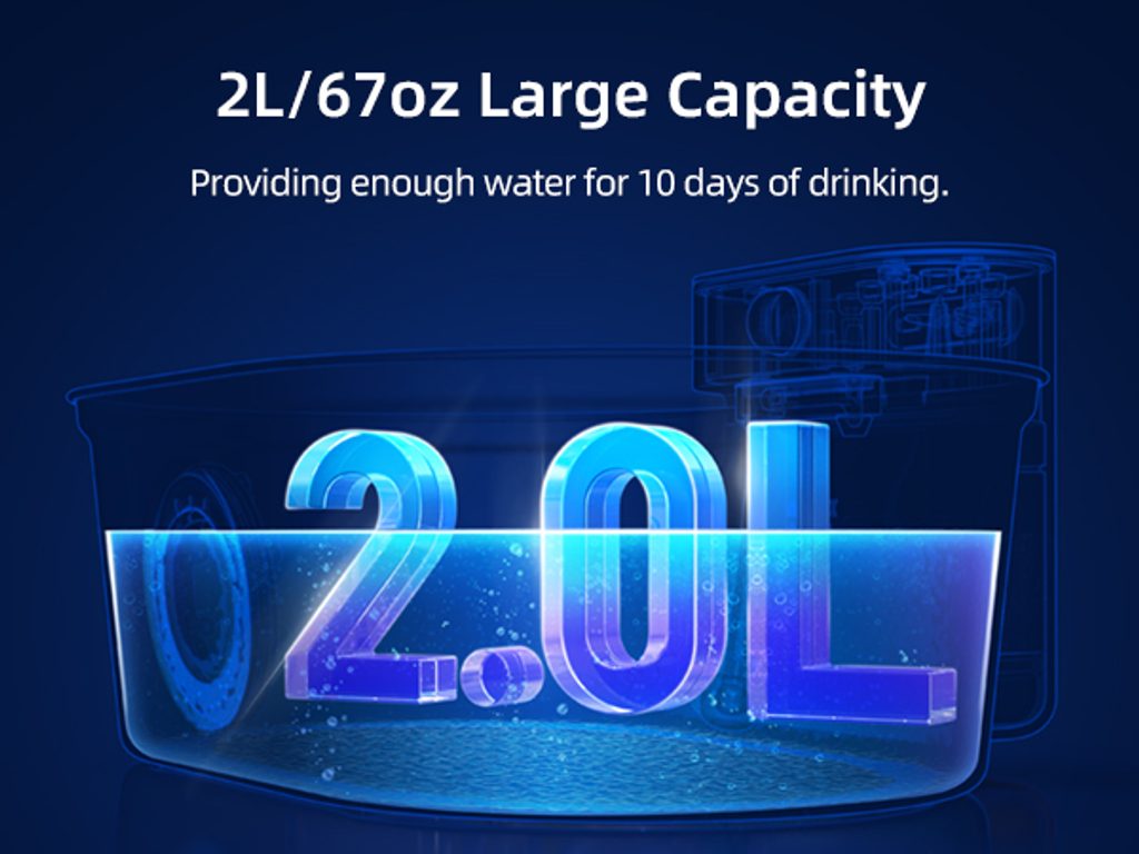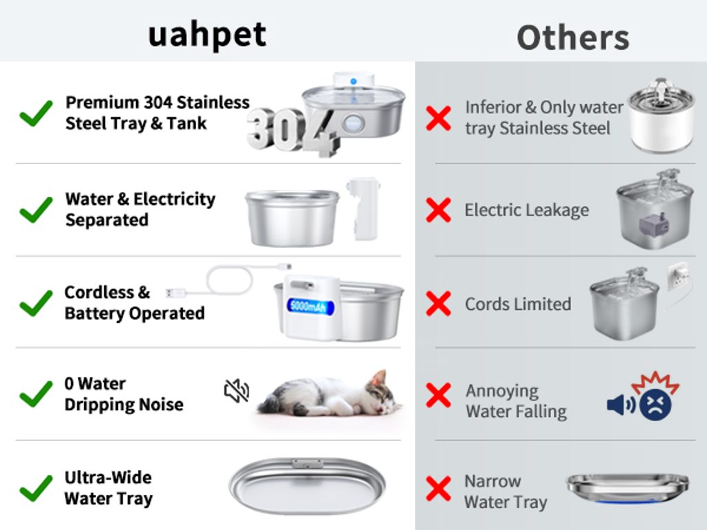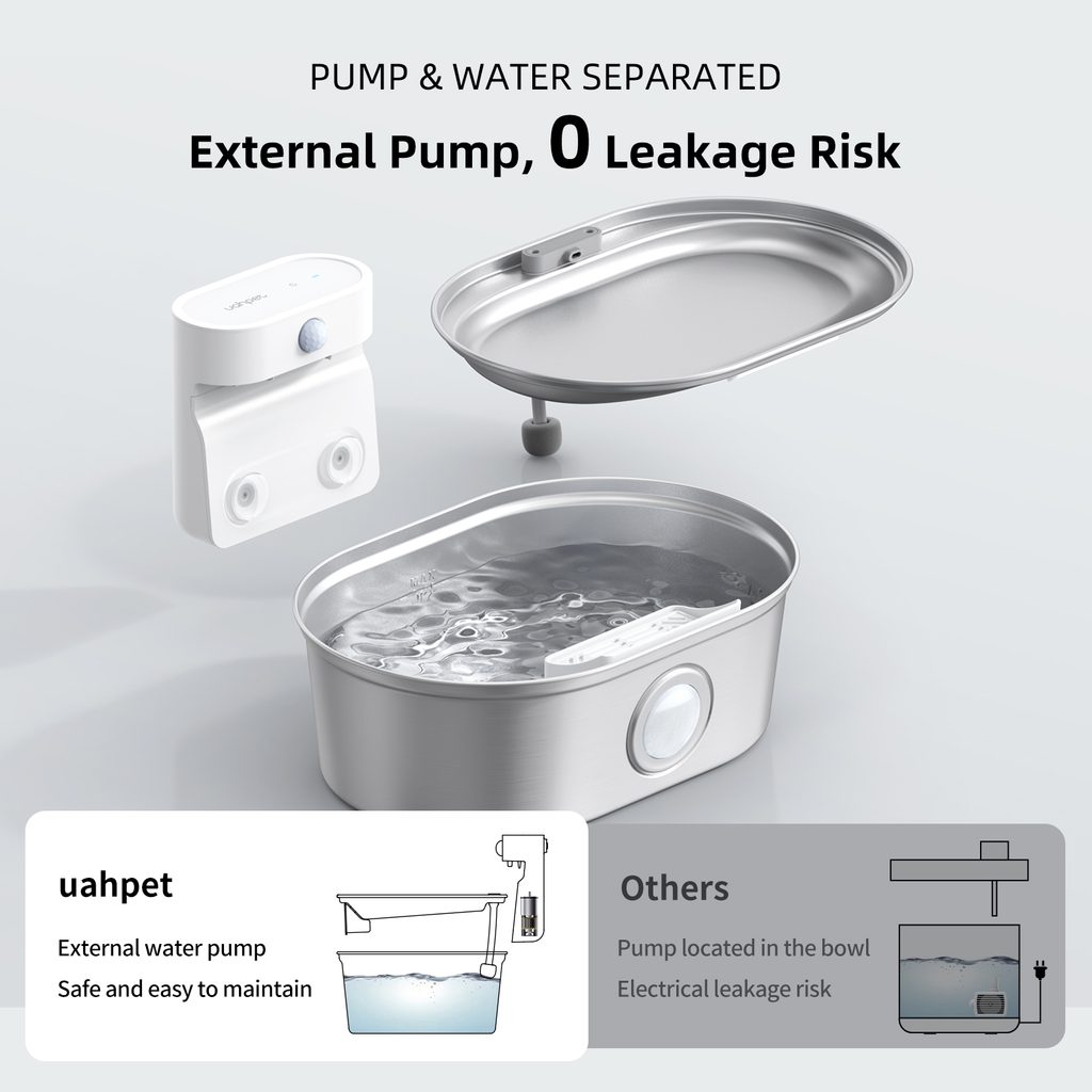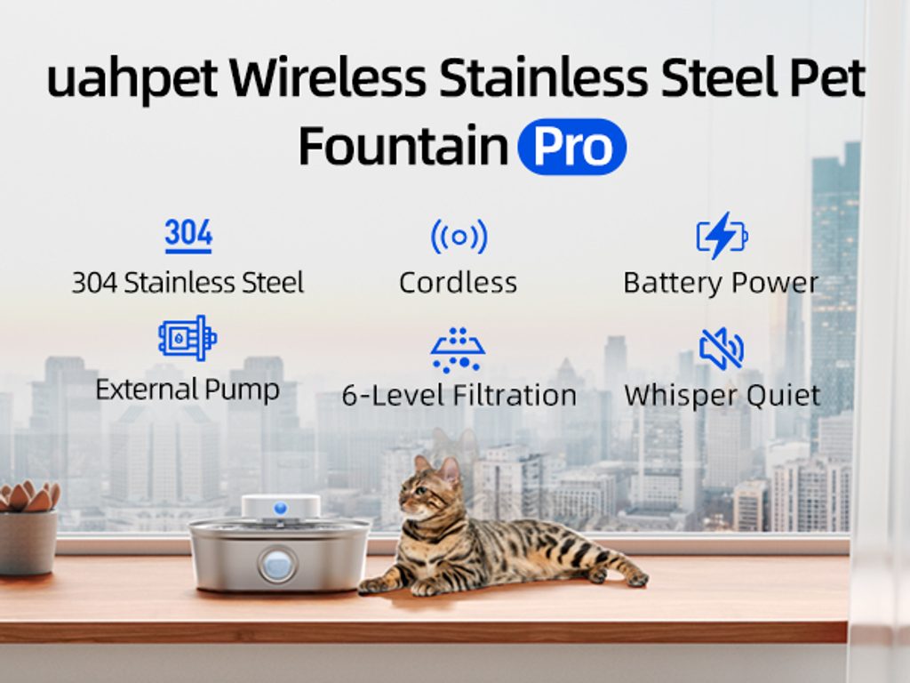 The UahPet Pro cordless stainless-steel fountain has a 2-litre capacity. This means it can last up to 15 days of continuous operation in a household with one or two cats. The large-capacity 5000mAh battery is sufficient for up to 45 days of operation. There is no need to charge the fountain frequently.
