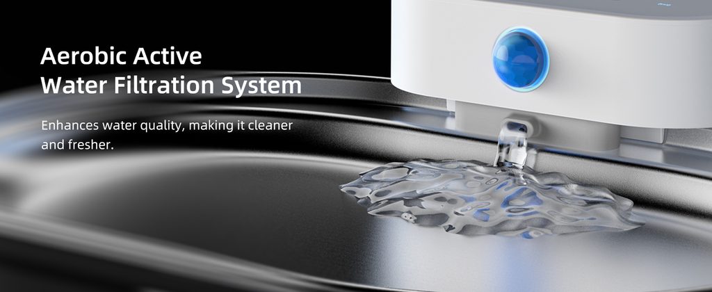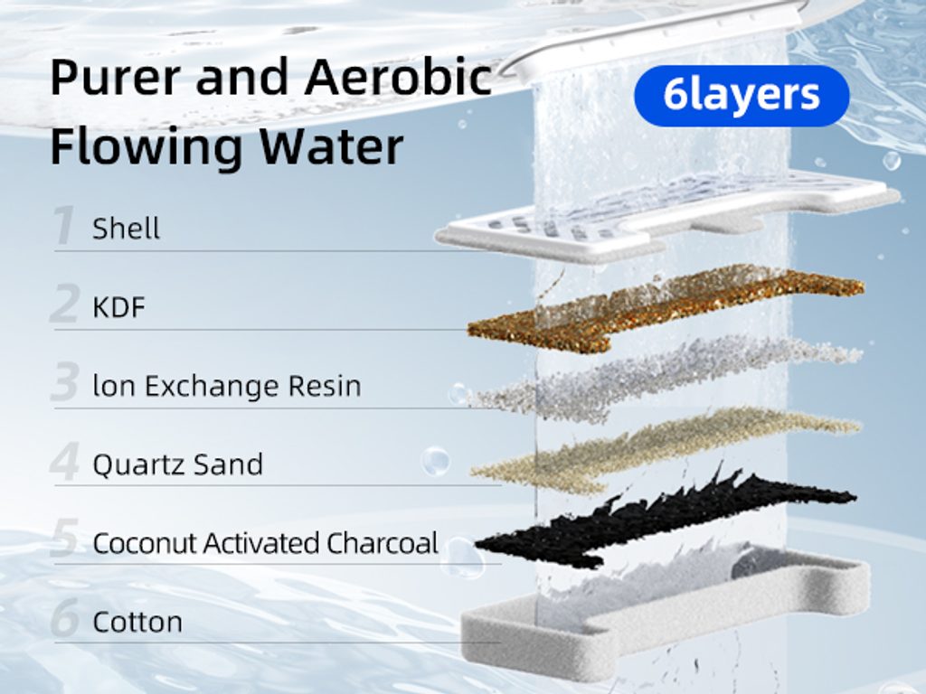 The filtration is 6-layer, which means it cleans the water perfectly. Activated carbon from coconut shells and KDF filter media absorb pollutants and bind heavy metals, chlorine and other impurities found in tap water. Ion-exchange resin softens the water and helps prevent kidney stones, silica sand prevents damage to sensory organs, and PP cotton protects against parasites and removes pet hair. The comprehensive filtration system ensures perfectly clean and always fresh water for your pets.