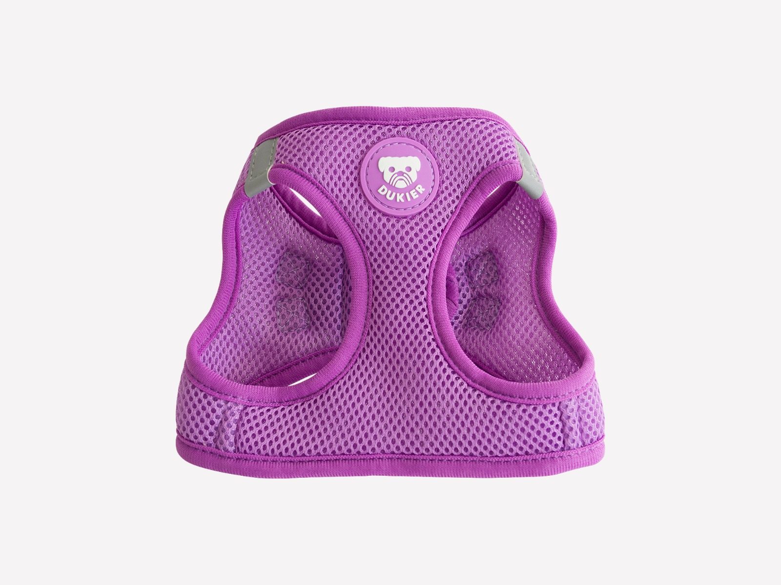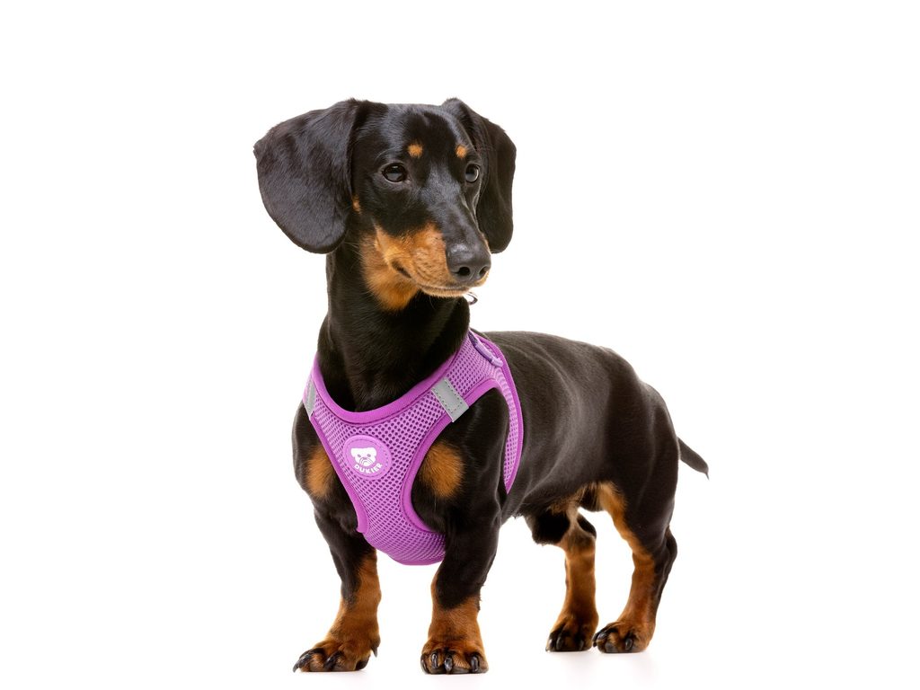 Functional harness made of lightweight and breathable material for small and medium sized dogs who appreciate the possibility of more movement during walks. Easy to fasten and unfasten with double buckle and a ring on the back of the harness for attaching a leash.