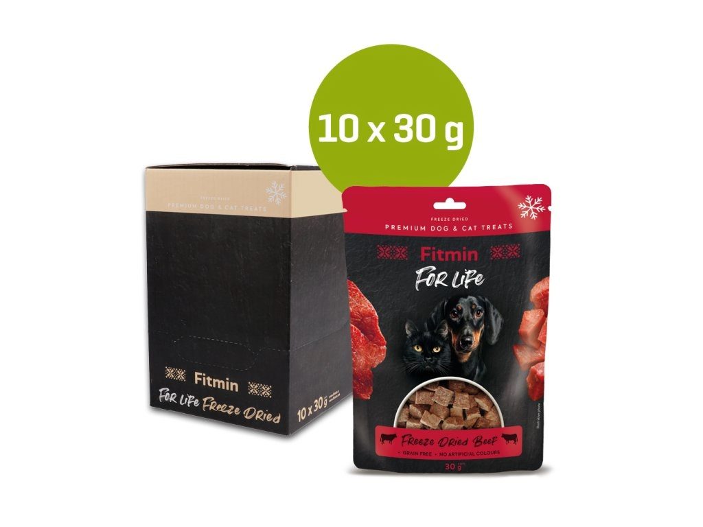 Fitmin For Life dog & cat freeze-dried meat Beef 10x30g is a pure meat treat processed using the unique lyophilization technology, which preserves all the flavor and nutritional value of fresh ingredients. An ideal reward for sensitive digestion and even the fussiest taste buds. Premium 100% freeze-dried beef in a great-value pack of 10 pieces. Completely free from grains, preservatives, and colorings.